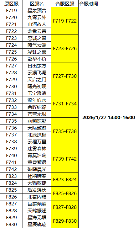 游戏将于以下时间对部分区服进行停机合服操作,开服时间会根据实际情况提前或延迟,请相互转告!