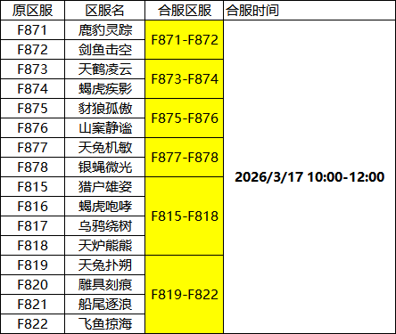 游戏将于以下时间对部分区服进行停机合服操作,开服时间会根据实际情况提前或延迟,请相互转告!