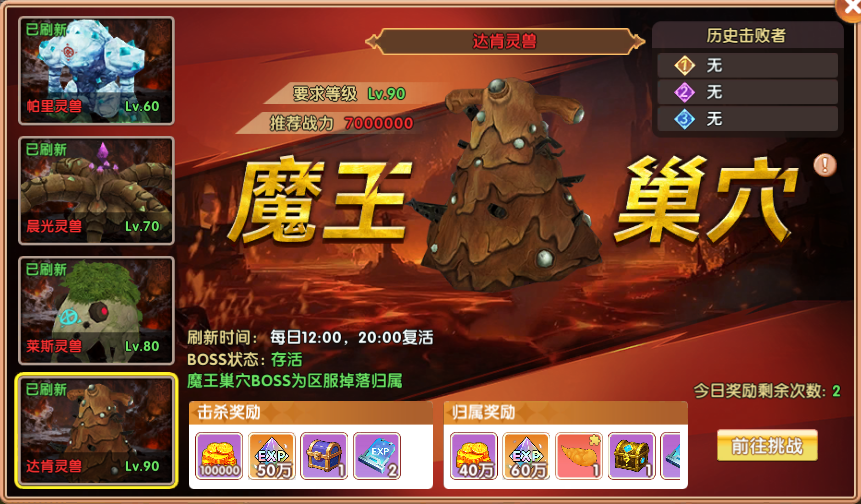 瑞加大陆新危机!“魔王巢穴”暗流涌动,请即刻深入,迎战魔王! 更新时间:2025年10月23日 10:00-12:00 更新范围:F31-F717 开服时间以游戏实际为准 1. 新增跨服BOSS争夺玩法“魔王巢穴”,玩家达到60级,服务器满足开放天数达到75天后开启; 2. 新增限时“创世开端”活动,玩家可以通过完成任务获得丰富的奖励内容; 3. 新增“公会狩猎”上限层数至12层,并修改最后一层可以重复挑战; 4. 新增40级“英雄”套装“凋零套装”; 5. 新增“打造”功能内“英雄商店”,可以购买“英雄装备自选箱”; 6. 新增“魔物洞窟”上限层数至16层; 7. 新增公会弹劾会长功能,会员职级以上的玩家可以在会长72小时未在线后进行弹劾,弹劾后发起弹劾的玩家成为新会长。 1. 初步修复因法师“龙卷飓风”击退导致的无法移动的问题; 2. 修复已上锁装备不能放入仓库/装备库的问题; 3. 修复3v3“排位赛”中可以通过卡地形躲避攻击的问题; 4. 修复复活后仍受“丘比特卡”debuff影响的问题; 5. 增强“元素熔炉”光环的永久属性,5星光环元素暴击提升至25%、元素爆伤提升至100%、元素抗暴提升至34%; 6. 修复及优化其他已知的问题。 调整各地图大领主刷新时间 巨型菲菲龙、帕里灵兽、休赖扎调整到17:00;巨剑浪人、巨眼主宰、巨型巴科洛调整到19:00;莱斯灵兽、达肯灵兽调整到20:00;巨蛙跳蝠、致命的报丧女妖调整到12:00。更新计划