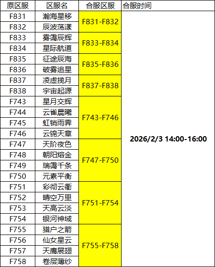 游戏将于以下时间对部分区服进行停机合服操作,开服时间会根据实际情况提前或延迟,请相互转告!