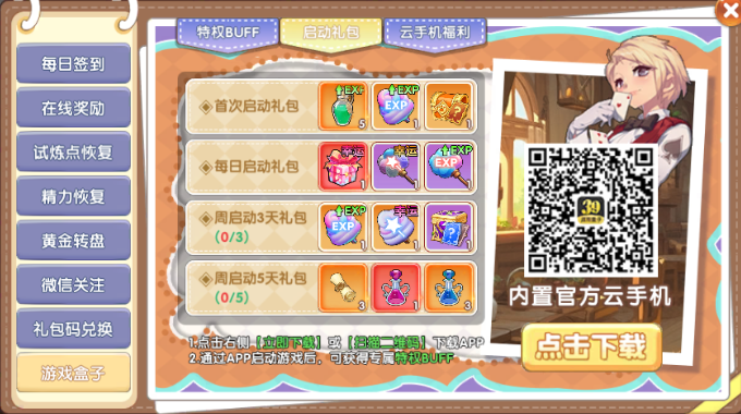每日通过【39游戏盒子】启动游戏,即可免费获取【每日启动礼包】,每日仅限一次!记得每天启动哦!