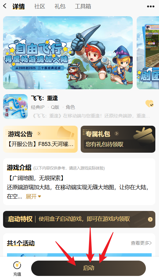 进入【飞飞:重逢】游戏社区,点击右上角“启动”打开游戏。
